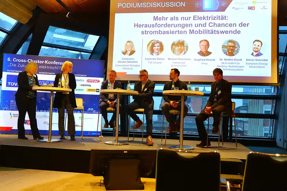 Zwar ist die Zukunft der Schifffahrt und der anderer Verkehrsträger zu Lande und in der Luft elektrisch, doch setzen der herausfordernde Stromnetzausbau und die mangelnde Verfügbarkeit von strombasierten Kraftstoffen der Elektrifizierung derzeit noch Grenzen. Das war das Fazit des abschließenden Experten-Panels der 6. Cross-Cluster-Konferenz, zu der die Ausrichter Erneuerbare Energien Hamburg, Hamburg Aviation, Hamburg Cruise Net, Hafen Hamburg Marketing, Logistik-Initiative Hamburg, Maritimes Cluster Norddeutschland und egw:wirtschaftsförderung am 4. Februar 2026 rd. 190 Teilnehmende im Hotel Hafen Hamburg begrüßen konnten.