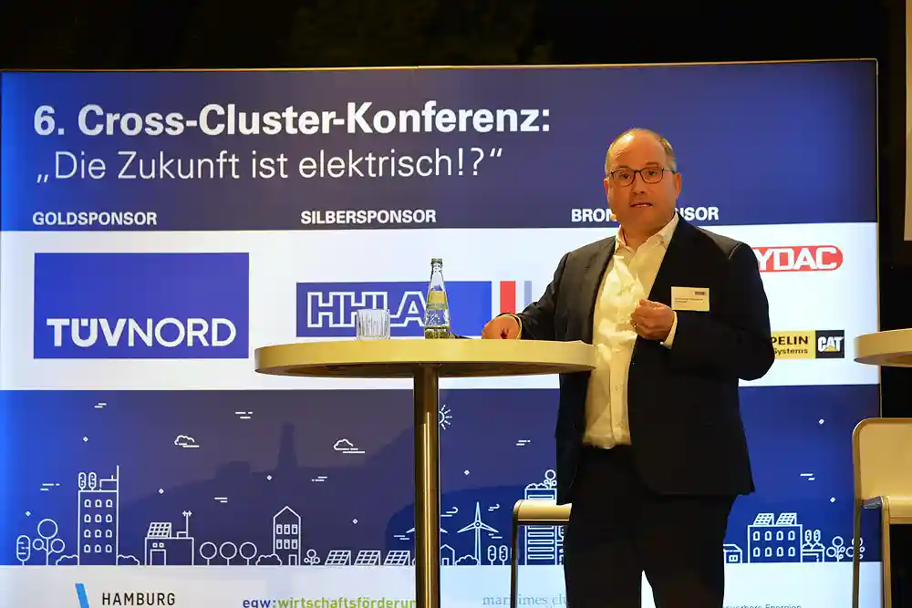 „Die fortschreitende Elektrifizierung in den Sektoren Energiewirtschaft, Industrie und Logistik der Metropolregion Hamburg ist ein zentraler Baustein für die Erreichung der ambitionierten Klimaschutzziele unserer Bundesländer. Wir werden damit unabhängiger von fossilen Energieimporten, schaffen neue nachhaltige Wertschöpfung und zukunftsfähige Arbeitsplätze, womit auch die überregionale Wettbewerbsfähigkeit der Wirtschaftsstandorte in der Metropolregion gestärkt wird. Natürlich sind verlässliche Rahmenbedingungen auf Bundes- und Landesebene eine essenzielle Voraussetzung für die weitere positive Entwicklung – daran arbeiten wir gemeinsam über die Landesgrenzen hinaus. Die Cross-Cluster Konferenz ist eine gute Gelegenheit für den Austausch zwischen Wirtschaft, Politik und Wissenschaft und unterstützt neue partnerschaftliche Kooperationen, so Joschka Knuth, Staatssekretär im Ministerium für Energiewende, Klimaschutz, Umwelt und Natur des Landes Schleswig-Holstein., in seiner Grußadresse zur Eröffnung der Veranstaltung.