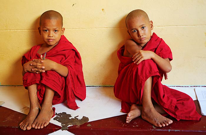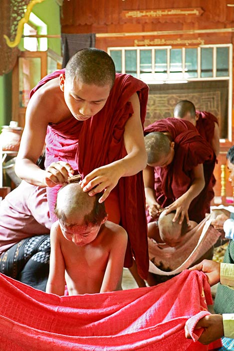 In Maukkadaw, einem kleinen Ort am Flussufer, ist in erster Linie das Kloster berühmt. Schon von Weitem ist der bunte Prozessionszug zu erkennen, der eine Vielzahl von jungen Novizen bis an die Pforten des Klosters führen wird. Seit Jahrhunderten ist die monastische Bildung der zentrale Grundpfeiler jeglicher Ausbildung. Schulen nach westlichem Vorbild sind zunehmend Dank der vielen Spenden aus dem Ausland auf dem Vormarsch, können aber die Bedeutung der älteren Mönche in den Klöstern für die schulische Ausbildung der jungen Menschen nicht ersetzen. Und so sparen die Eltern mit Buben im geeigneten Alter und legen einmal jährlich ihr Bares zusammen, um eine der Tradition entsprechende Initiation im Sinne einer Novizen-Prozession zu ermöglichen. Nach dem Vorbild des letzten Buddhas, Siddhartha Gautama, der bis zu seinem 28. Lebensjahr als Prinz und Sohn von Königin Maja nur das luxuriöse Palastleben in Indien kennengelernt hat, werden die angehenden Mönche geschminkt und in feinsten Roben hoch zu Ross durch die Gemeinde geführt. Da Erleuchtung aber nur durch Meditation und den ‚mittleren Weg‘ zu erlangen ist, werden die Buben zum Abend den etablierten Klostermönchen übergeben. Hier entlegen sie sich ihrer schmucken Gewänder und werden nach alter Sitte den Mönchen gleich geschoren. Mit Glatze und frohem Mut werden ihnen feierlich ihre neuen, kleinen Mönchsroben übergeben und von nun an heißt es, den Regeln des Ordens zu folgen.