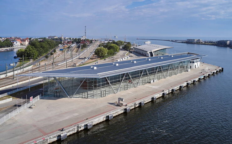 Nach anderthalbjähriger Bauzeit konnte am 2. Juli 2020 am Liegeplatz P 8 im Warnemünder Werftbecken das zweite Passagier- und Service-Terminal „Warnemünde Cruise Center 8“ (WCC8) mit rd. zweimonatiger Verzögerung und nur wenigen Restpunkten eingeweiht werden. Der von dem Rostocker Architekturbüro Bastmann & Zavracky entworfene Neubau,