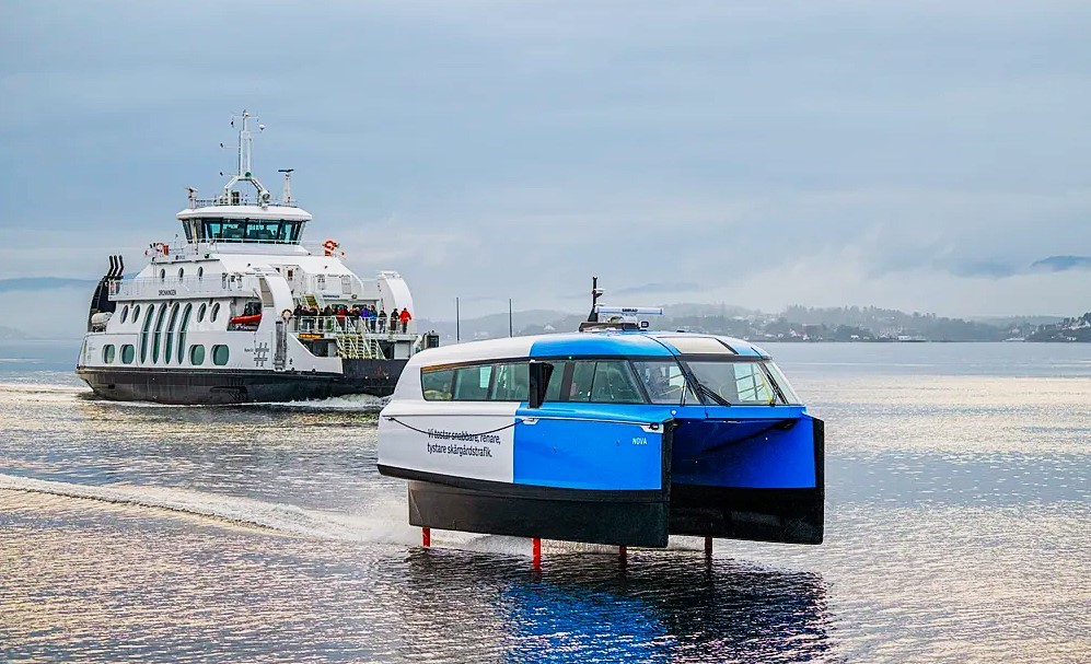 Hydrofoil-Elektrofähre des Typs Candela P-12, die 2025 in Oslo, Trondheim und mehreren Städten in Ostnorwegens erfolgreich getestet worden war. Im Hintergrund die konventionelle Nesodd-Fähre „Queen“, Foto: Candela