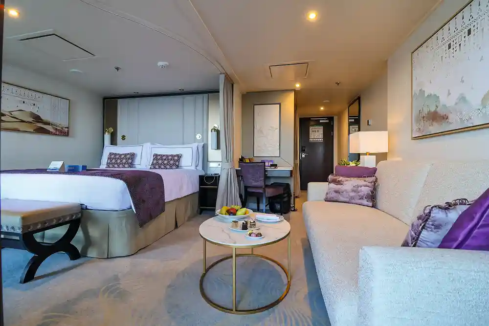An Bord öffnet sich eine andere Welt. AROYA hat die frühere­ WORLD DREAM mit ihren ehemals grellen Farben komplett umgestaltet. Warme Töne von Sand, Creme und Terrakotta, goldene Ornamente und weiches Laternenlicht schaffen eine Atmosphäre zwischen Hotel und Palast. Das arabische Design wirkt elegant und beruhigend – überhaupt nicht protzig. Die Kabinen spiegeln diesen Stil wider. Die Khuzama-Suiten bieten 24h-Butler-­Service für kleine Wünsche, Reservierungen und Ausflugstipps; Getränke, Internet sowie ein exklusives Restaurant mit Lounge & Bar sind inklusive. Im öffentlichen Bereich setzt das Schiff ebenfalls Akzente: Die „Lady Hours“ am Adults-only-Pool schaffen Rückzugszeiten nur für Frauen – täglich vormittags bis 12 Uhr. Auch Spa und Fitnesscenter bieten exklusive Zeiten für Frauen. Die Atmosphäre bleibt durchgängig entspannt. Bikini neben Burkini. Die Mischung ist selbstverständlich, das Nebeneinander respektvoll. Das vermittelt ein Gespräch mit einem jungen Paar aus Saudi-Arabien.