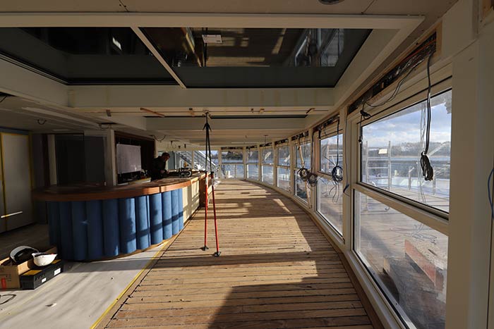 Besonders innovativ: Der Pop-up-Aufzug, der die unteren Decks mit dem Sonnendeck verbindet, aber wegen der wechselnden Höhen unter Brücken komplett im Boden dieses Decks versenkt werden kann. Exklusiv wird sicherlich die Marina werden. Die etwa 40 Quadratmeter große Plattform kann bei Bedarf vom Heck des Schiffes abgesenkt werden und soll Zugang für Wassersportmöglichkeiten oder privater Anleger für individuelle Ausfahrten wie Sunshine-Touren mit einem kleinen eleganten Boot sein, das übrigens dann vom Kapitän höchstpersönlich gesteuert wird. Darüber hinaus ist auch angedacht, hier direkt am Wasser an einigen Tischen einen Bar- und Bistro-Service anzubieten.