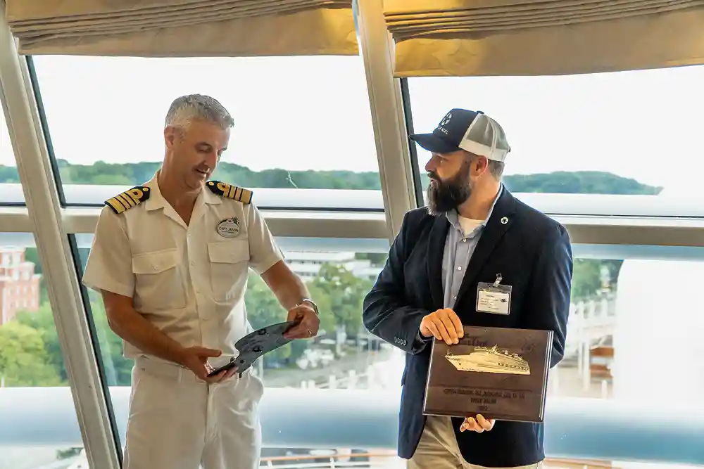 Beim Empfang der Besatzung um Kapitän Erstanlauf überbrachte für den Seehafen Kiel Timo Beyer, Leiter des Hafenbetriebs, die traditionelle Erstanlaufsplakette und übergab sie symbolisch an Kapitän Micky Maus, der Themenfigur der Disney Dream. Die Übernahme vollzog dann Kapitän Jason Preston in Amtshilfe für Micky Maus.