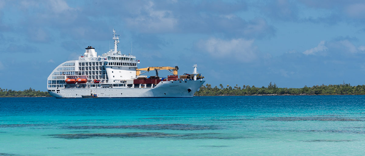 Die Aranui 5 wartet am Dock, blitzblank, seit 2015 im Einsatz. Auf dem Pool-Deck trommeln Ozeanier, Getränke werden serviert, jede Kabine hat ein Bullauge. Bei der 14-tägigen Fahrt liegt die Reisegeschwindigkeit bei 15 Knoten.