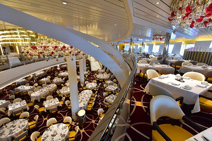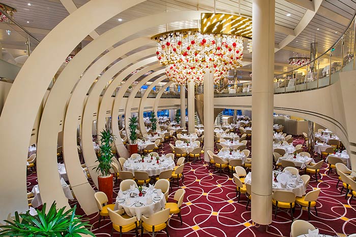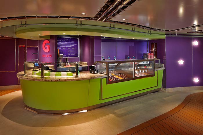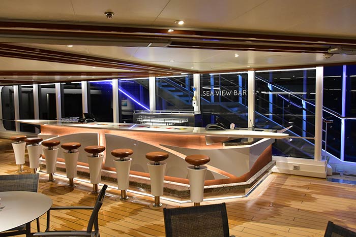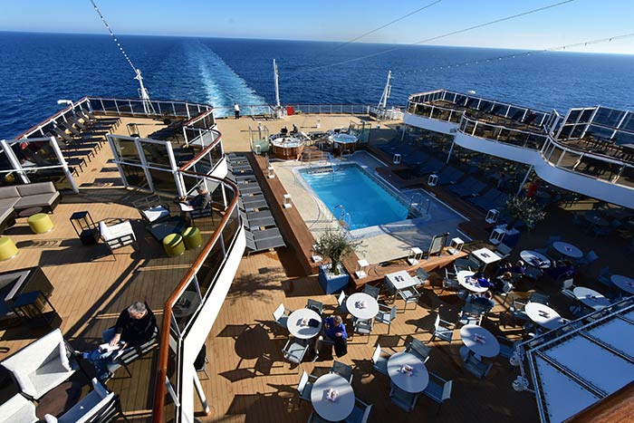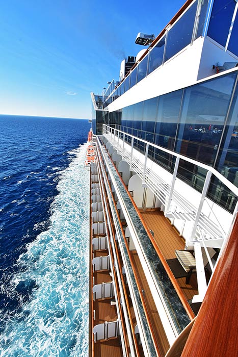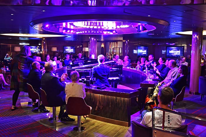 Das Crow‘s Nest kombiniert wie in gewohnter Art und Weise Café, Lounge und Bibliothek. Hinzu kam jetzt noch die Ausstattung mit Informations-Schaltern für Ausflüge und zu Fragen über die Destinationen. Es ist aber vor allem eins: Ein Ort der Ruhe und des Blicks übers Meer. Die Flagge der Niederlande am Heck und Rotterdam als Heimathafen spiegeln sich in einem hohen Anteil niederländischer Offiziere um Cyber de Boer wider. Beim Entertainment ist Musik aus Holland aber klar in der Minderheit. „Wir haben mit dem Lincoln Stage Center und dem Rolling Stone Rock Room etwas geschaffen, was den Geschmack der Passagiere trifft. In der Plaza auf Deck 2 haben die Architekten ein Ensemble aus musikalischen Inseln geschaffen. Zentraler Treffpunkt ist da das Atrium. Hier wurde mit den ineinander geschwungenen Treppen die Architektur der Serie übernommen.