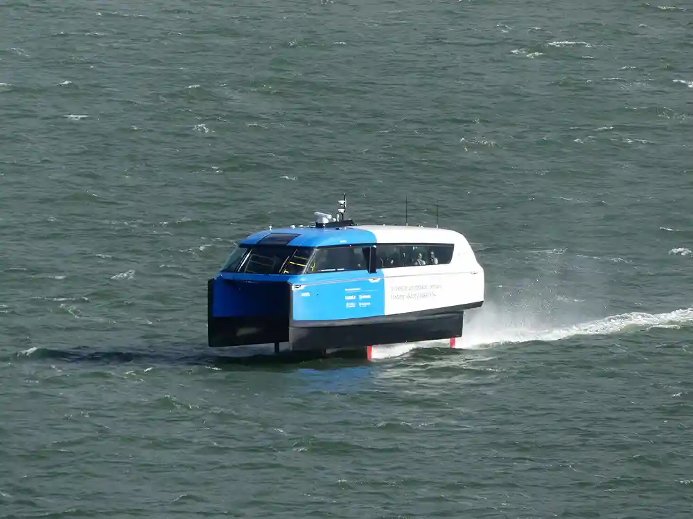 Die P12 vom schwedischen Start-Up Candela kann bis zu 30 Fahrgäste befördern. Das Besondere ist dabei, dass das Schiff förmlich über das Gewässer schwebt. Dafür nutzt das Elektroboot die sogenannte Hydrofoil-Technik: Der Rumpf des Schiffs wird von Tragflügeln einen Meter über die Wasseroberfläche gehoben und erreicht eine Reisegeschwindigkeit von 25 Knoten (46 km/h). Laut Candela sinkt der Energieverbrauch durch den wegfallenden Wasserwiderstand um 80 Prozent. Entsprechend steige die mit einer Batterieladung mögliche Reichweite.