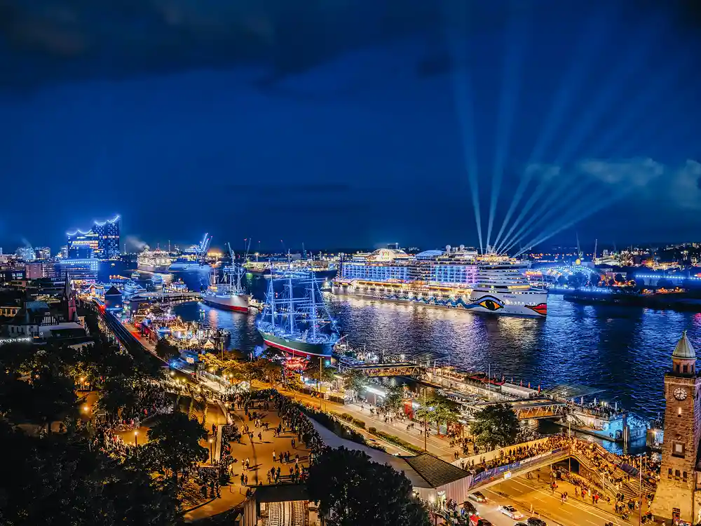 Am Samstagabend, 13. September 2025, verwandelte sich die Elbe in Hamburg in eine schwimmende Bühne. Die Auslaufparade von vier Kreuzfahrtschiffen begleitet von Musik, Licht und Feuerwerk, zählt zu den Höhepunkten der Hamburg Cruise Days. Kapitän Pedro Ziegler reihte sich mit AIDAperla in die Schiffsinszenierung ein und startete anschließend zu einer Metropolenreise entlang der atlantischen Westküste. Die Gäste an Bord von AIDAperla erlebten die einmalige Stimmung aus der ersten Reihe. Am Elbufer verfolgten auch in diesem Jahr zehntausende Zuschauer das Spektakel.