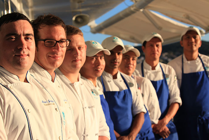 Auf dem Oberdeck trifft man sich zum ersten Mal; der von den philippinischen Stewards ausgeschenkte Champagner fließt in Strömen, an der Openair-Bar, die zu dieser Stunde ihren Namen „Sunset-Bar“ mehr als zu Recht trägt, werden die farbenprächtigsten Cocktails gemixt. Der spanische Gitarrist und Pianist Craig intoniert dazu eine stimmungsvolle und diskrete Hintergrundmusik. Die Schiffsoffiziere stellen sich persönlich bei den neuen Gästen vor, plaudern sich von Gruppe zu Gruppe.