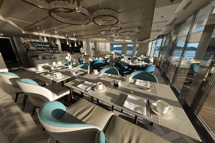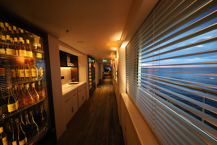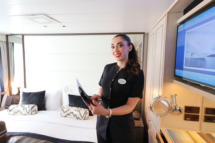 Das Einchecken an der Rezeption ist eine Sache von Minuten. Charmiane aus Großbritannien, die sonst im SPA arbeitet, begleitet die Gäste auf die Kabine, beendet die Formalitäten auf dem Ipad. Nur selten kommt man bei einer Kreuzfahrt so smooth auf dem Schiff an. Die Reederei hat lange daran gearbeitet, das Ankommen auf den Schiffen der Flotte so stressfrei und angenehm wie möglich zu gestalten. Das Gleiche gilt für das Ende der Reise – an der Rezeption gibt es auf diesem Schiff – soweit gesehen – keine Staus.