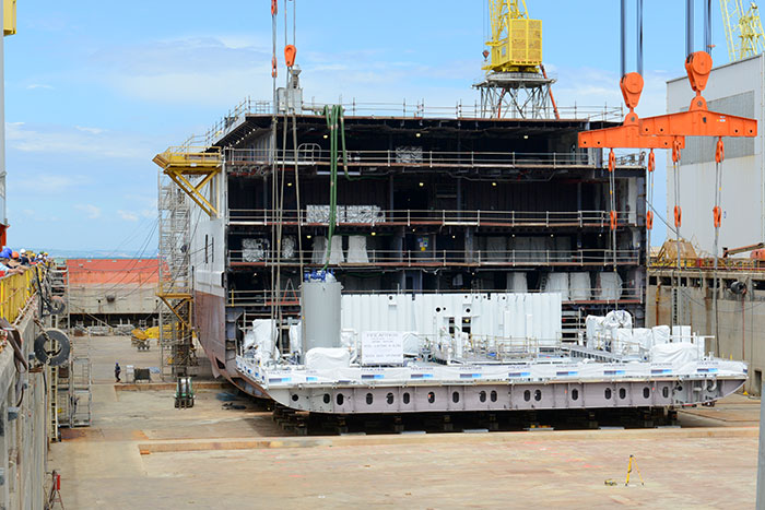 Entgegen den Erwartungen war es nicht die erste Sektion für die Kiellegung des bis zu seiner Taufe noch als Werft-Nr. 6281 geführten Neubaus, die der bis zu 500-Tonnen tragende Portalkran der Werft bei blauem Himmel und strahlendem Sonnenschein für das Absetzen auf den Pallen im Trockendock mit drei Traversen an die Haken genommen hatte: In dem erst durch das am 10. Mai erfolgte Ausschwimmen des an den benachbarten Ausrüstungskai verholten 47500-BRZ-Neubaus Viking Jupiter – er soll im im Juni 2019 als sechster Neubau an Viking Ocean Cruises abgeliefert werden – freigewordenen Dock wartete bereits ein am 14. Juni von der Fincantieri-Werft in Palermo zugelieferter sechs Decks hoher Mittelschiffsblock. Daran war jetzt die 450 Tonnen schwere vorausgerüstete Maschinenraum-Bodensektion anzusetzen. Sie gehört zu den insgesamt 210 Sektionen für den aus 60 Blöcken bestehenden Schiffskörper der Seven Seas Splendor, die bis auf den aus Palermo zugelieferten Block – sämtlich in Ancona gefertigt werden. Elf davon waren bereits weitgehend montagefähig auf dem Werftgelände zu sehen.