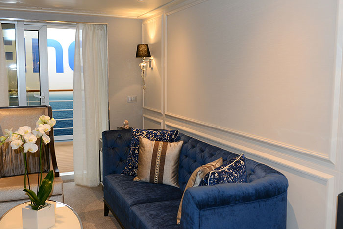 Die bei einer Länge von 224 m, einer Breite von 31,1 m und einem Tiefgang von 7,1 m auf eine Vermessung von ca. 55200 BRZ-kommende Seven Seas Splendor, die mit ihrer dieselelektrischen Maschinenanlage (4 Hauptdiesel mit moderner Abgasreinigung) über zwei Festpropeller eine Dienstgeschwindigkeit von 21,5 kn erreichen soll, verfügt über 13 Decks, davon 10 für Passagiere. Das im November 2019 auszudockende und im Januar 2020 abzuliefernde, dessen Baupreis von ca. 450 Millionen Dollar durch Kostensteigerungen und Upgradings nach Reedereiangaben auf etwas mehr als 500 Millionen Dollar erhöhen dürfte, wird ausschließlich über Suiten mit Balkonen für seine 750 Gäste verfügen. Im Anschluss an die Kiellegung konnten die Gäste im werftnahen Magazini Generali der Fritelli Maritime Group neben Interieur-Details wie Säulen die öffentlichen Räume, Visualisierungen von Lounges oder der Gestaltung des Theaters sowie Muster der eingesetzten Materialien auch zwei 1:1-Show-Suiten der Kategorien Concierge und Penthouse in Augenschein nehmen, auf die die Mehrheit der zwischen 28,5 und 413 qm großen Suiten des Neubaus entfällt. „Mitglieder unseres Operation-Managements haben mit Architekten und Designer mehr als fünf Stunden in den Mock-Ups verbracht, um jedes kleinste Detail zu optimieren“, verriet Reedereichef Jason Montague. „Wir haben diese Suiten und das ganze Schiff mit akribischer Detailverliebtheit entworfen: Von der Stärke des Türgriffs bis zum Stil der Stühle wurde betrachtet, um ein Schiff zu schaffen, das Luxus perfektioniert“, so Robin Lindsay. Ebenso habe man auch die Vorschläge von Gästen berücksichtigt und beispielweise zwei Balkonzugänge sowie zwei Badzugänge mit größeren begehbaren Schränken und Spiegeln umgesetzt, Kunststoffoberflächen in Bädern durch Naturstein ersetzt oder eine vereinfachte zentrale Beleuchtungsschaltung gewählt.