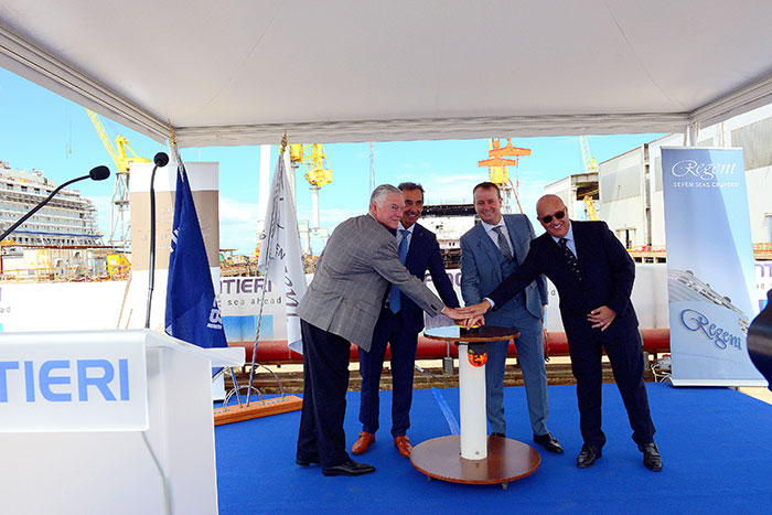 Nur dreieinhalb Monate nach dem ersten Stahlschnitt erfolgte bereits am 28. Juni beim Fincantieri-Werftbetrieb in Ancona die Kiellegung für ein optimiertes Schwesterschiff der Mitte 2016 abgelieferten Seven Seas Explorer. Jens Meyer war Zeuge des traditionellen Zeremoniells für die Seven Seas Splendor