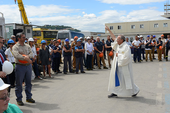 Anschließend segnete Anconas Hafenkaplan, Pater Dino Cecconi, nicht nur das Kontur gewinnende Schiff, sondern schloss auch Auftraggeber, Werftarbeiter und Gäste in seine Fürbitte ein. Die Reederei sei ein Segen, weil sie mit diesem Auftrag der Werft, ihren Mitarbeitern und den Zulieferern der Region Lohn und Brot verschaffe, die Arbeiter, weil sie mit ihrer Handwerkskunst und ihrer Qualifikation, die Voraussetzung für die Hereinnahme solcher Aufträge ermöglichen und die Gäste, weil sie durch ihre Buchungen der Reederei helfen, die Finanzierung solcher Neubauprojekte dazustellen.