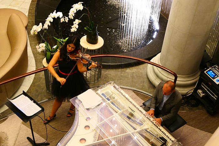 Das Ankommen ist Auftritt zugleich: Die Pagen stehen Spalier, der Welcome-Champagner wird eiskalt serviert. Das Atrium der Crystal Symphony könnte aus einem Film der goldenen Jahre der klassischen Kreuzfahrt stammen: Freitreppen, Statuen, ein über zwei Decks reichender Wasserfall, daneben ein durchsichtiger Flügel aus Plexiglas, das Crystal Piano, dessen Klänge sanft bis nach oben dringen.