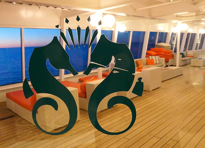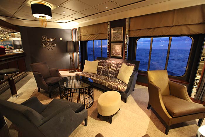 Hier schlägt das Herz des Schiffes: Rezeption, Excursion-Desk und Concierge. Zum Warten und Chillen ist neben den Kanapees im Atrium die Bar Crystal Cove mit ihren bequemen Sesseln bestens, Live-Musik fast ganztags und abends inklusive, auch zum Aperitif vor dem Dinieren im Hauptrestaurant „Waterfront“.