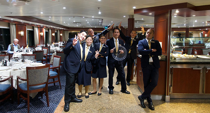 94 Passagiere haben sich an Bord der Silver Explorer eingerichtet. Sie schlendern über die blauen Teppiche mit Seemannsknoten und betrachten die nautischen Ausstellungsstücke in der Observation Lounge. Auch wenn der Tagespreis auf eine eher wohlhabende Klientel schließen lässt, gibt es keine Allüren an Bord: Die Waschmaschinen und Trockner für die Passagiere laufen auf Hochtouren. Die Reinigung nutzt kaum jemand. Und das Geschmeide kann zu Hause bleiben. Trekkingsandalen, Expeditionshut und Fernglas gehören zum Dress code.