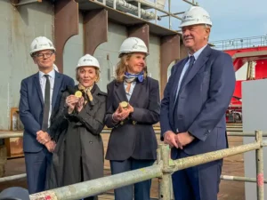 Patin von Chantiers de l’Atlantique war Agnès Sahores, Smart Yard Improvement Manager, die seit 25 Jahren für die Werft tätig ist. Sie leitet die Umsetzung der Prozessoptimierungen des Unternehmens, die sich auf industrielle Leistungsfähigkeit, Innovation, Umwelteffizienz und kollektiven Erfolg konzentrieren.