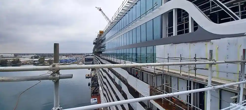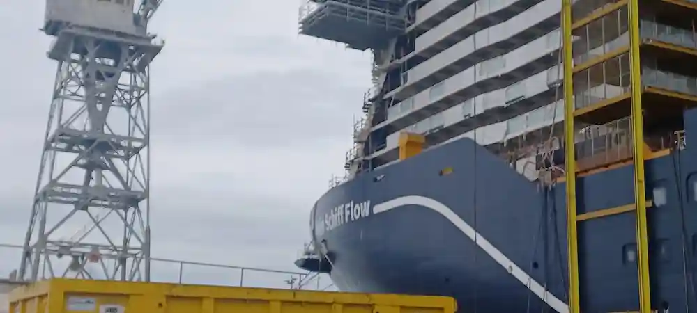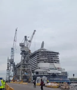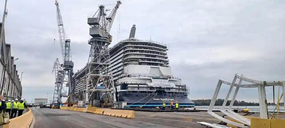 Werftbesuch Mein Schiff Flow auf der Fincantieri-Werft in Monfalcone bei Triest: Es braucht schon einiges an Vorstellungsvermögen, um bei einem Rundgang auf der seit 2023 in Bau befindlichen Mein Schiff Flow jetzt schon zu erkennen, wo gerade der Spa-Bereich, die finnische Sauna, die Shopping Area oder das Theater, das große Atrium mit der Rezeption, großer Treppe und Bars entstehen. Bei guten Willen sind die Ränge im großen Theater zu sehen, einige Bars mit Anschlüssen für Wasser und Elektrizität sind auch angedeutet. Doch statt eines Barkeepers sind unzählige Arbeiter aus aller Herren Länder am Werkeln. Im Schiffsbauch installieren Techniker den innovativen gas-elektrischen Antrieb, einen Dual-Fuel-Motor der sowohl mit LNG-Erdgas als auch mit Methanol betrieben werden kann. Aktuell sind an die 3.400 Menschen unterschiedlichster Gewerke auf der Werft allein mit dem Bau der Mein Schiff Flow beschäftigt. Dabei, sagt Wybcke Meier, CEO von TUI Cruises stolz, seien bereits 70 Prozent des Bauvolumens geschafft. Dem laienhafte Blick der Besucher erschließt sich das kaum bei der Vielzahl an Kabeln, Leitungen und sonstigen technischen Versorgungskanälen die aus Wänden und Böden hängen. Immerhin ist schon eine halb fertige Standard-Kabine mit Balkon zu besichtigen.