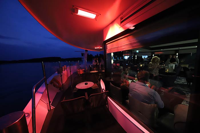 Gastronomisch wird einiges geboten: Neben dem Hauptrestaurant gibt es ein Deck tiefer das „Manhattan“, ein stylishes intimes Restaurant, in dem auch Jazz geboten wird. Gut für Paare: Hier gibt es viele Zweier-Tische. In „Mario’s Grill“ am Heck des Schiffes können die Gäste auch später noch Grillspezialitäten von Fisch und Fleisch aus der Showküche genießen. Zum Restaurant gehört auch ein kleiner Open-Air-bereich. Namensgeber und Eigner Mario Ferreira bestaunte nach der Zeremonie „sein“ Restaurant und ließ sich dort von seiner charmanten Frau Paula per Handy verewigen.