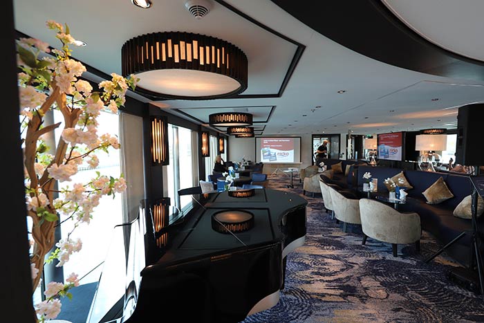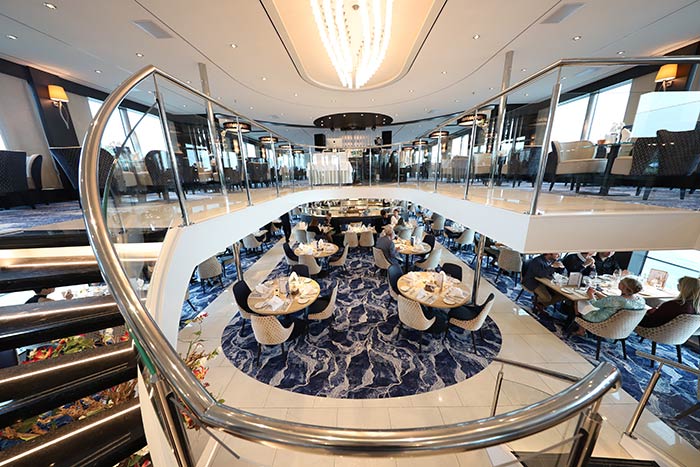 Besonders interessant: die Öffnung zwischen Lounge und Hauptrestaurant, ein Bereich, der sich über zwei Decks erstreckt und enorm viel Licht und Platz und beste Sicht nach außen sowie eine stylishe Bar mit Auenbereich bietet.