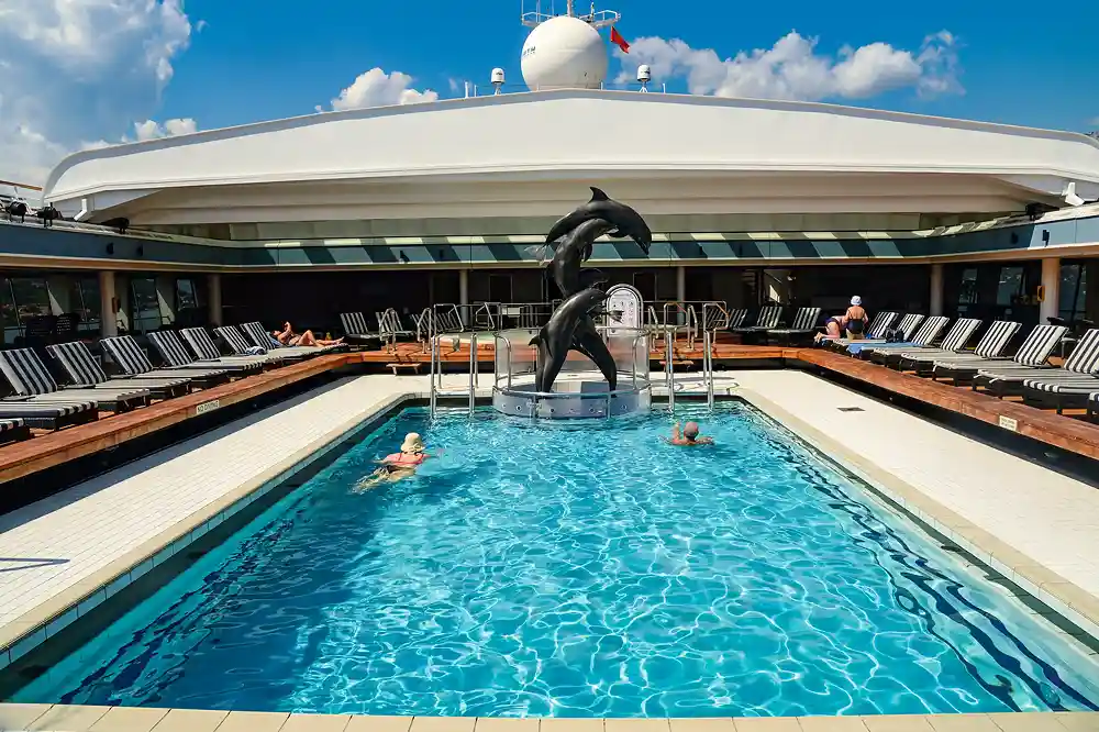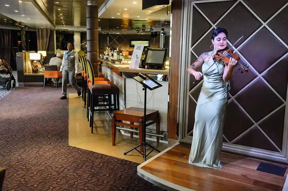 Die CELESTYAL JOURNEY ist, als sie den Hafen von Piräus verlässt, mit 1.278 Passagieren fast ausgebucht, und diese Schiffsgröße macht sie angenehm und überschaubar. Natürlich ist das verschwenderisch-luxuriöse Platzangebot der frühen Tage geblieben: Zwei völlig getrennte Poolbereiche, ein ruhiger am Achterdeck, und unter einem aufschiebbaren Glasdach vorm Schornstein ein weiterer mit Bühne, Bar und Eis-Salon. Kein Schiff dieser Größe (außer jenen, die mit der früheren RYNDAM vor über 30 Jahren in Dienst gestellt wurden, dazu gehört u. a. die VASCO DA GAMA) hat eine solche Vielfalt an Bars und Restaurants. Zum Beispiel das Buffet, das mit Regalen und Nippes verspielt eingerichtet ist, mit seinen nicht enden wollenden Stationen, an denen Pasta à la minute zubereitet, Braten frisch aufgeschnitten wird und auch exotische Geschmäcker zu ihrem Recht kommen. Im Hauptrestaurant hingegen, dessen frühere Emporen abgetrennt und in italienische bzw. asiatische Sonderrestaurants für die Suitengäste verwandelt wurden, überwiegt mediterrane Küche in all ihrer Vielfalt: Griechischer Salat, italienische Pasta, Hähnchen mit Zitrone in Weißweinsauce und zum Dessert eine Selektion türkischer Köstlichkeiten, während sich am Nachbartisch Mutter und Tochter aus Spanien redlich bemühen, eine Konversation auf Englisch hinzukriegen.