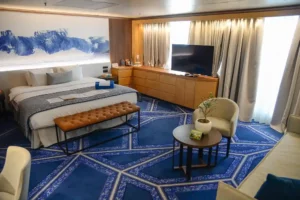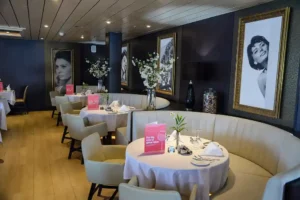 Sie ist obercool: riesige Sonnenbrille, lederne Handschuhe, rechts ein Champagnerglas, und in der Schnauze … Wie bitte? Doch, es stimmt schon; in diesem Outfit ziert eine schwarze Bulldogge die Bildtapete im Atrium und bringt Urlaubsstimmung ins Schiff. Das drei Decks hohe Foyer glänzt in maritimem Blau und edlem Messing. Als die CELESTYAL JOURNEY 1994 gebaut wurde, hieß sie RYNDAM und gehörte zu einer neuen Serie der Luxusreederei Holland-America-Line. Das Atrium mit den ausladenden Treppen, Cafés und Shops war ein Vorläufer der bis zu zehn Decks hohen Lichtschächte, die man in den frühen 2000er Jahren baute und die gegenwärtig gerade wieder aus der Mode kommen.