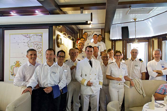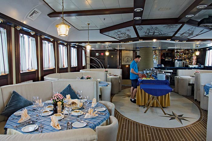 Hotelmanager Robert hat viel Erfahrung im Gepäck. Seit 20 Jahren arbeitet der Österreicher in dieser Position, seit fünf Jahren hat er zudem eine Beraterfirma. „Luxus ist Service mit einem Lächeln“, definiert er mit strahlenden Augen. „Und Service bedeutet, die Wünsche des Gastes zu erfüllen, bevor dieser sie kommuniziert hat.“ Ein hoher Anspruch, der angesichts der wohlhabenden Klientel an Bord angebracht scheint. Doch Robert winkt ab: „Die Gäste hier sind viel einfacher zu händeln als Drei-Sterne-Passagiere, denn sie wissen genau, was sie wollen.“ Und wenn den Passagieren der Sinn nach Erdbeer-Daiquiri steht, läuft Robert beim nächsten Hafenstopp eben los, um frische Erdbeeren zu kaufen. Wenn es nach ihm geht, kommt noch mehr Luxus an Bord. Kaviar – schließlich sei es doch einrussisches Schiff – oder Hummer könnte er sich vorstellen. Und der Eigner hat ein offenes Ohr für seine Vorschläge, das sei das Schöne an der Arbeit in einer kleinen Reederei.