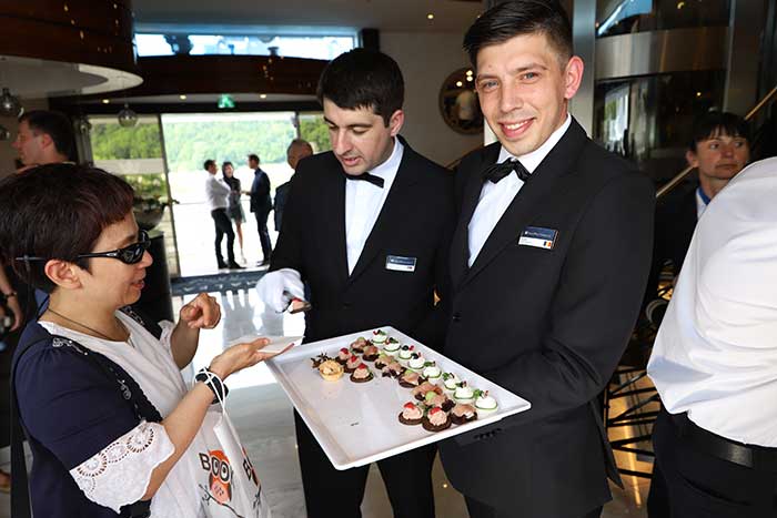 Wie bei den letzten Taufen von AmaWaterways strahlte auch heute an diesem 26. Mai die Sonne vom bayrischen Himmel. Lokale Musikkapellen und Gesangsgruppen sorgten für gute Stimmung, Buffets und Bars für das leibliche Wohl. Taufpatin Filomena Andre von AAA-Travel, eine bekannte Persönlichkeit aus dem amerikanischen Reisemarkt, warf dann nach den Ansprachen der Ama-Chefs Rudi Schreiner und Kristin Karst sowie dem Bürgermeister von Vilshofen und der Segnung durch den örtlichen Priester, die Champagnerflasche an den Bug des Täuflings. Abends wurde die Feier beim Galadinner mit anschließendem Feuerwerk fortgesetzt.
