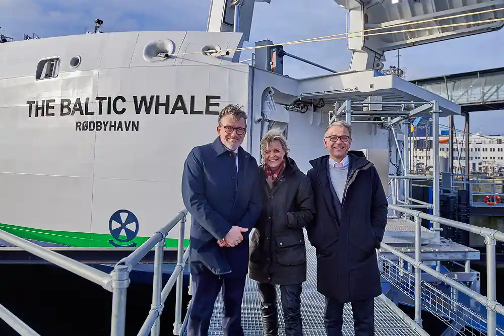 Sie gehört zu den größten batteriebetriebenen Fähren der Welt und kann den in Kürze beginnenden Regelbetrieb auf der Route Puttgarden – Rødby völlig emissionsfrei absolvieren: Der jüngste Neubau der deutsch-dänischen Fährreederei Scandlines ist am 7. Januar 2026 als erste batteriebetriebene Frachtfähre der Reederei in seinem Heimathafen Rødbyhavn auf den Namen The Baltic Whale getauft worden. In Anwesenheit von Scandlines-CEO Eric Gregoire und Scandlines COO Michael Guldmann Petersen sowie geladener Gäste, darunter der türkische Botschafter R. Hakan Tekin, die Bürgermeisterin von Lolland Kommune, Marie-Louise Brehm, und Guldborgsund Kommune-Bürgermeister Simon Hansen, ließ die als Taufpatin fungierende Think Tank Europa-Chefin Lykke Freiis die obligatorische Champagnerflasche am Rumpf ihres Täuflings zerschellen.