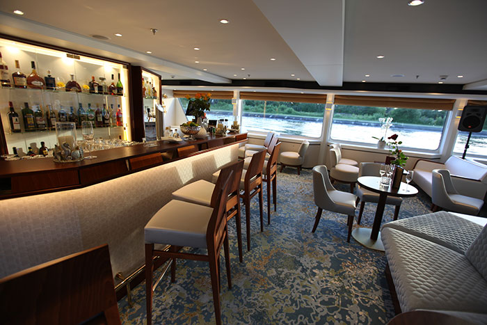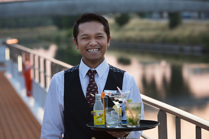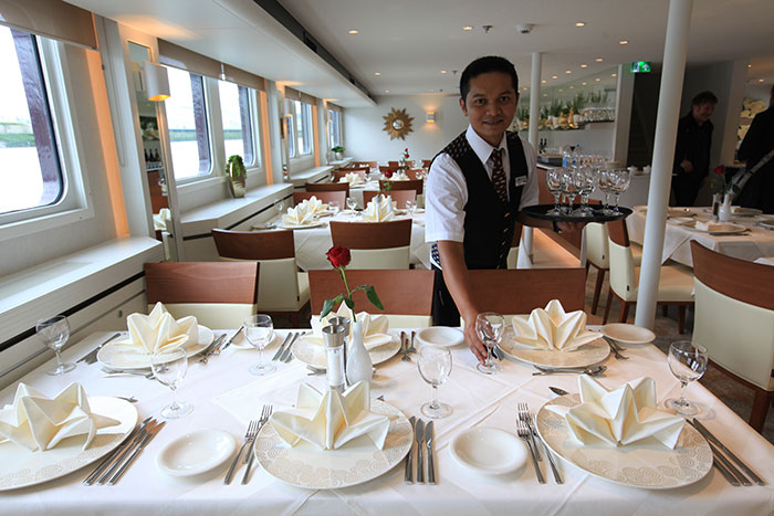 Die Excellence Pearl kann bis zu 80 Passagiere an Bord nehmen, zusätzlich 25 Personen Besatzung – heuer aus elf Ländern. Die Bordsprache ist Deutsch, die Philosophie des Schiffes schweizerisch. Der Deutsche Robert Kratzer, 32, zuständig für die Menüs auf allen Excellence-Schiffen mit Ausnahme der Excellence Katharina, setzt auf hohe Qualität, Frische der Produkte sowie auf regionale Spezialitäten – hier in Belgien etwa auf Moules et frites. Die Mahlzeiten werden serviert unter den wachsamen Augen von Eva Varga, 29, Maître Restaurant und Bar-Managerin aus Ungarn.