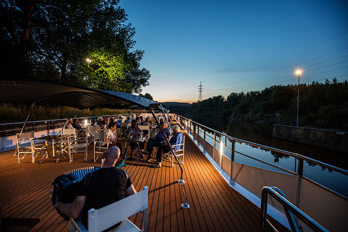 Alle Probleme löst Wilhelm Bahrs, 61,seit über sechs Jahren für Excellence als Hotelmanager unterwegs, der pensionierte Ruedi Sägesser ist für das Gelingen der Ausflüge zuständig. Die Reise beginnt in den Niederlanden und führt durch Belgien, wobei kurz auch Frankreich gestreift wird. Sanfte Ufer mit Gänsefamilien hier, kahle Wände in den Kanälen dort. Bei Charleroi sieht es besonders abgewirtschaftet aus: Am Ufer reihen sich verlassene und ausrangierte Bauten aus der Zeit der bis in die Sechzigerjahre blühenden Stahlindustrie aneinander. Industriearchitektur nicht ohne einen gewissen Reiz, perfekte Kulissen für Endzeitfilme. Allgemeine Bewunderung erntet hingegen das futuristisch anmutende Schiffshebewerk von Strépy-Thieu, das 73 Meter Höhenunterschied in einem Zug überwindet! Wie geht das? Ganz einfach: Das Schiff gleitet in eine Art Badewanne und wird raufgezogen oder runtergelassen. «Meine Freundin versteht es nicht, wie ich ein Schiff millimetergenau führen und das Auto nicht mal einparken kann» meint Kapitän Harscher, 50, schmunzelnd.