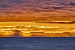 Der Snæfellsjökull ist ein Stratovulkan, berühmt durch Jules Vernes Reise zum Mittelpunkt der Erde. Der Berg hat etwas Mythisches: Viele Isländer betrachten ihn als spirituellen Ort. Das goldene Abendlicht und die geschwungenen Wolkenbänder schaffen eine geheimnisvolle Atmosphäre.
