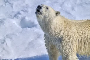 Nach dem Mittagessen scheint das Schiff in eine andere Dimension einzutreten. Wir fahren in den Nansenfjord. Die Bucht ist übersät mit großen Eisstücken, wie ein kompliziertes Puzzle. Der Kapitän „parkt“ das Schiff in Eis, das mindestens einen Meter dick ist. Von der Brücke und den Außendecks wird mit Ferngläsern aufmerksam nach Eisbären gesucht.