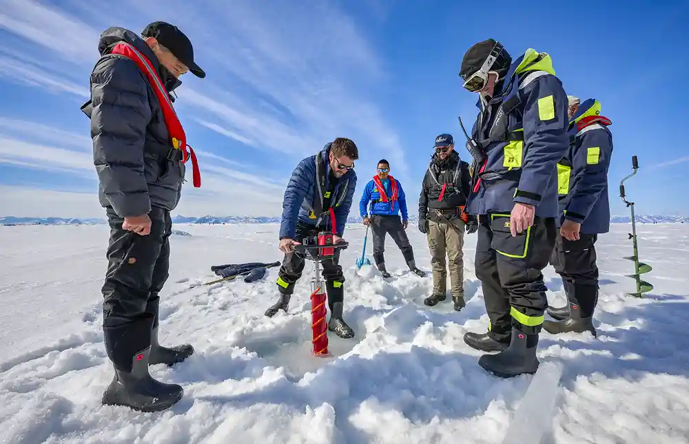 Währenddessen geht das Expeditionsteam an Land, bewaffnete Guides errichten einen Sicherheitsperimeter. Man weiß nie – mit Eisbären ist nicht zu spaßen.